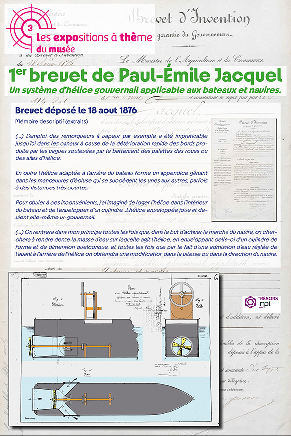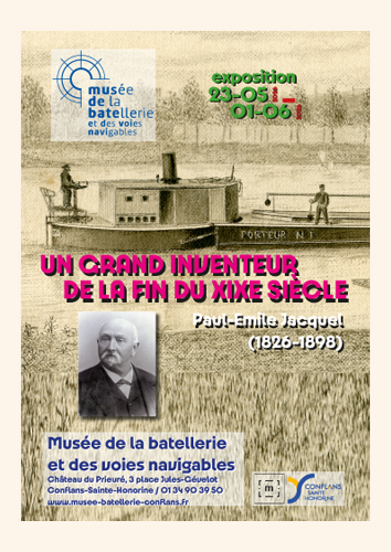 Maquettes d’étude et modèle réduit promotionnel, archives, photographies, plans, dessins et gravures…Un ensemble exceptionnel conservé depuis 150 ans dans la famille permet de rentrer dans l’intimité de l’inventeur du « système de bateau à propulseur ». Le brevet déposé en 1878 décrit en fait un convoi poussé (pousseur et sa barge) pour la navigation sur les canaux. Le « système Jacquel » va être longuement expérimenté puis mis en œuvre avec plusieurs unités exploitées au début des années 1880.