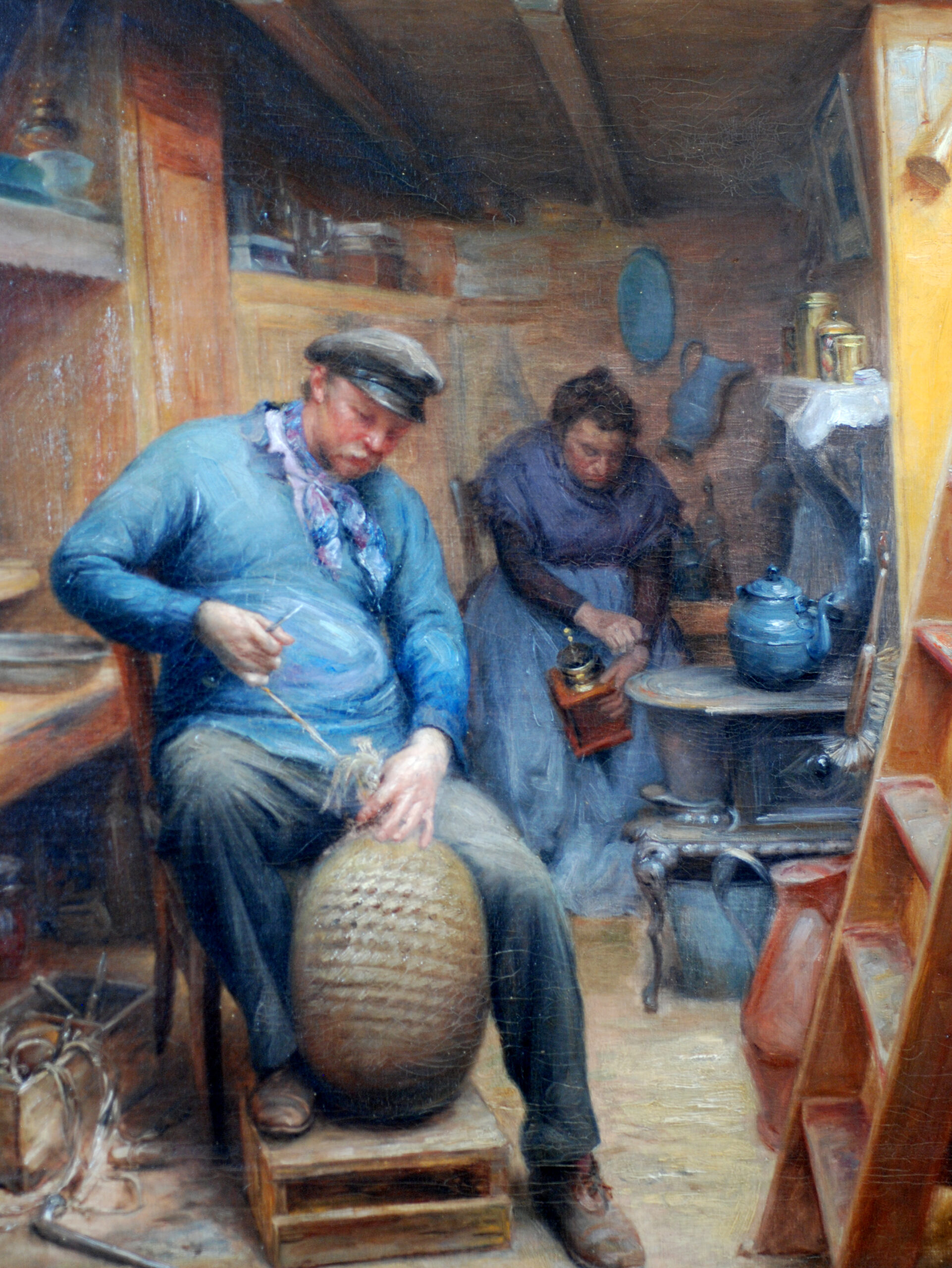 - Couple de bateliers dans une péniche : la confection d’un pare-battage et du café